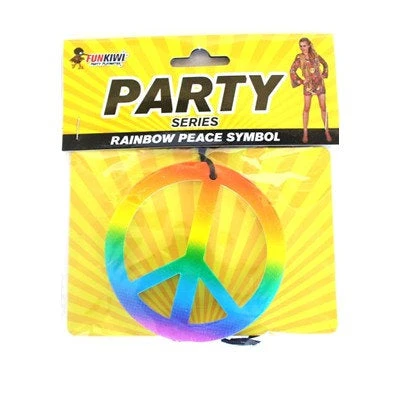 Bring peace and love to your next Hippie or 1960s themed party with this colourful Rainbow Peace Necklace. This psychedelic coloured necklace features a rainbow plastic peace sign hung on a gold string, perfect for any hippie outfit!!