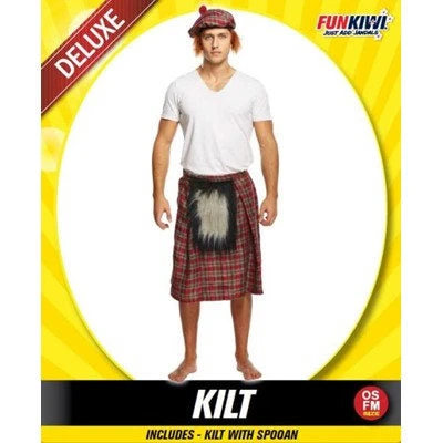 Mens Kilt Costume includes attached fur sporran. Add some face paint and you can become William Wallace. Tam O Shanter hats are also available in store.
