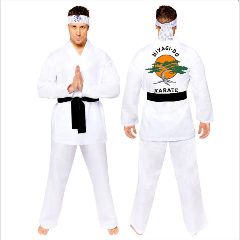 Miyagi De Karate Men’s costume from popular 1980’s movie The Karate Kid and Cobra Kai series.