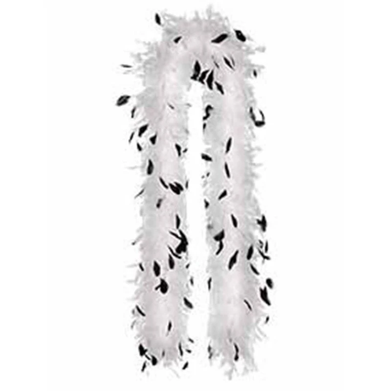 Add some glam to your Gatsby costume with our roaring 20’s white feather boa with black feathers.