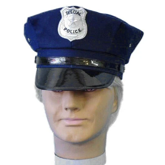 Blue “Special Police” hat with silver fabric badge and black visor, measures 59 cm.