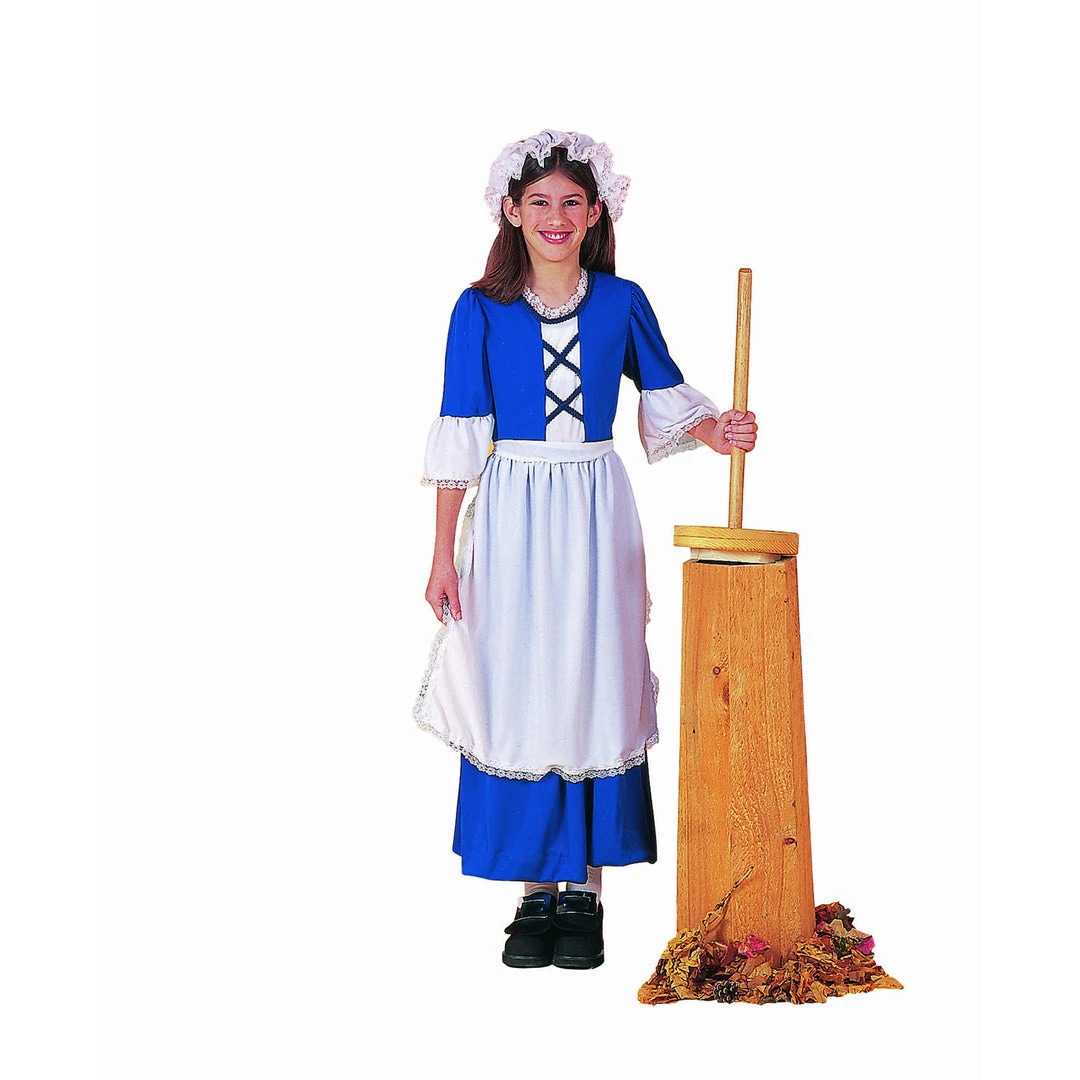 Includes: blue dress contrasting white cuffs, white apron and hat.