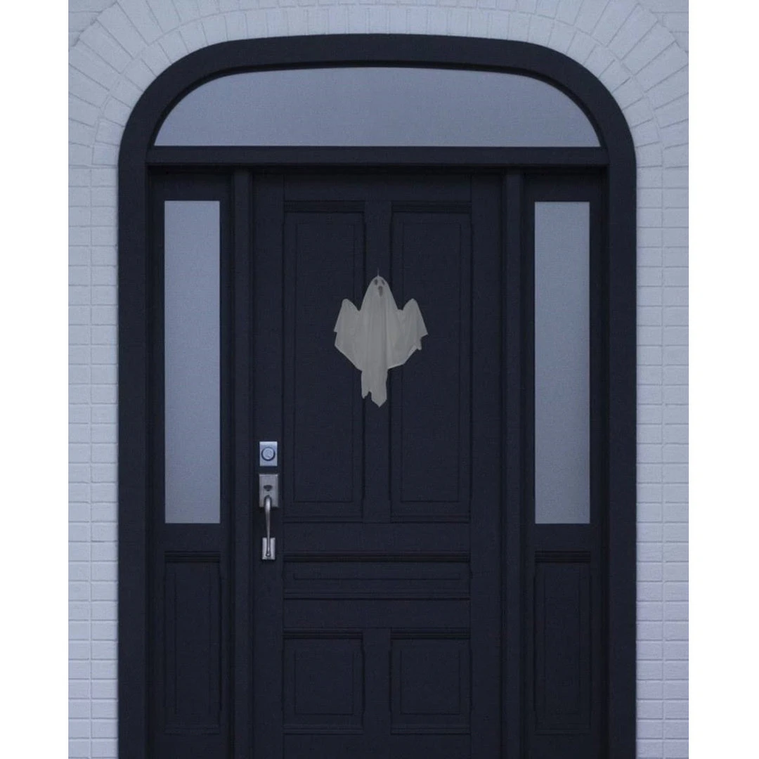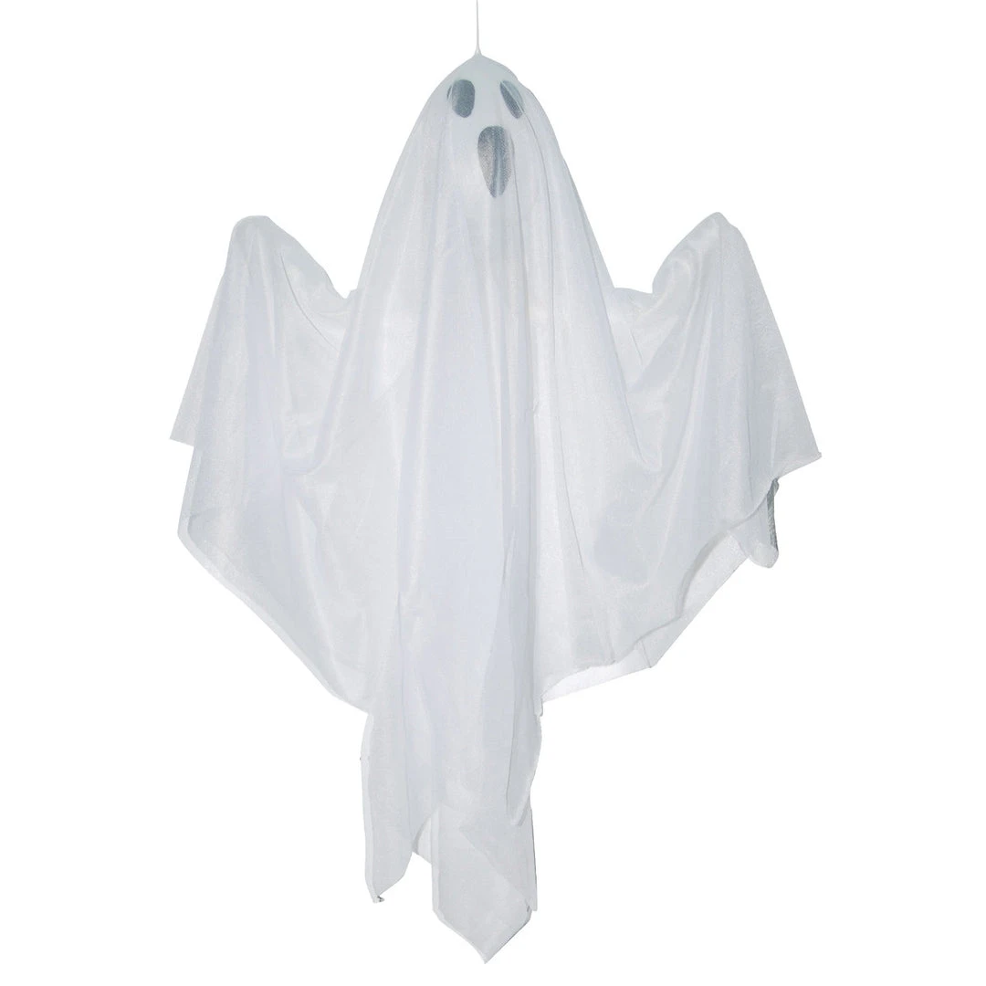 BOO!! This creepy floating ghost prop will take your unsuspecting trick or treaters by surprise!! This Hanging Ghost Halloween Prop features a creepy ghost face under a white fabric, it hangs 21 inches long and has 2 bendable wire rods for shaping the ghost!! Put it in your doorways, in hallways, in the middle of a room, hang it from trees or your rafters, wherever you hang this creepy floating white ghost prop will freak people out this Halloween!!