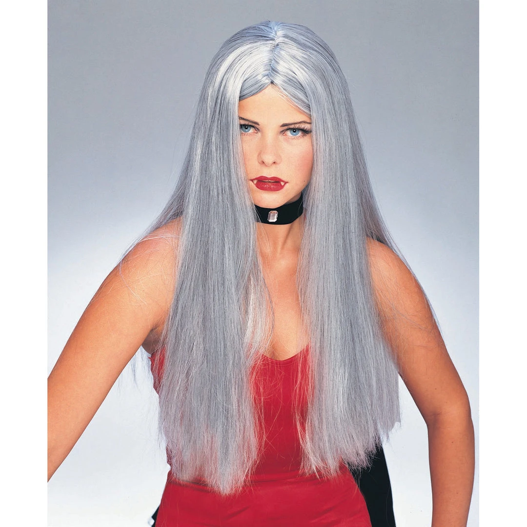 Ladies long grey wig without fringe, this is a great wig for theme parties like: