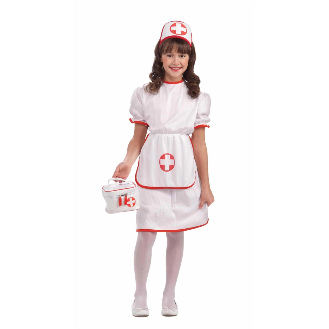 Girls Nurse Costume,white dress, puffy sleeves and attached apron with medical cross and headdress which ties on with medical cross.