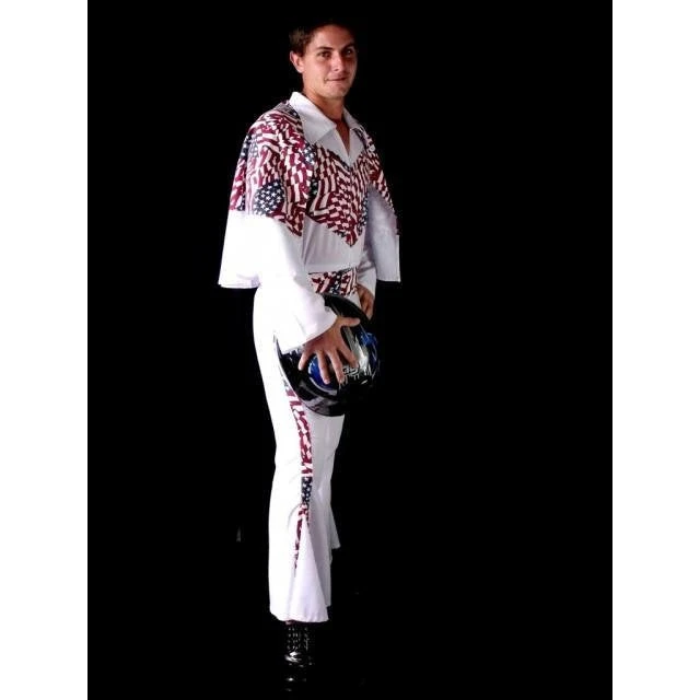 Perform some stunts of your own wearing this cool 70’s patriotic jumpsuit with attached cape. (a helmet is included but it is not exactly the same)