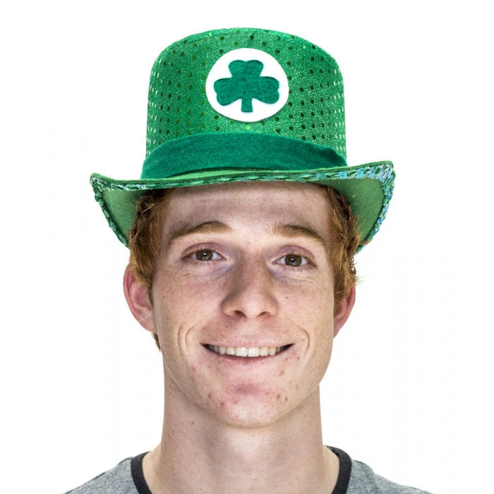St Patrick’s Day Clover Top Hat made from sequin fabric featuring a shamrock.