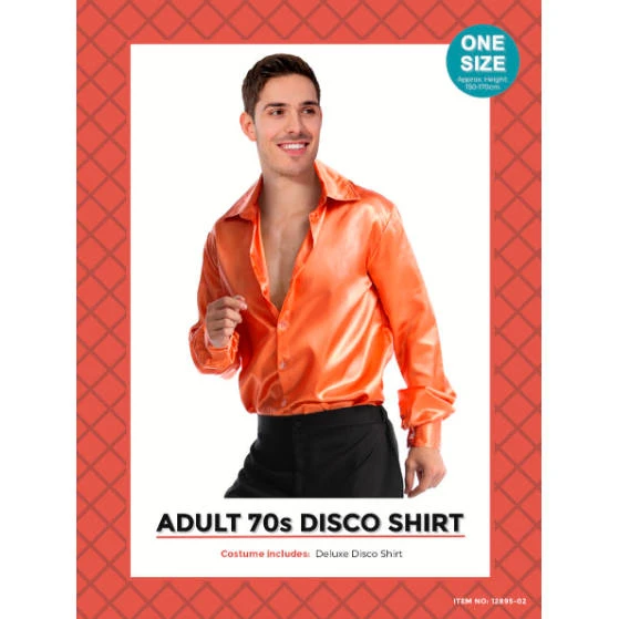 Adult 70’s Disco Shirt in Orange. Pair with white flares, gold chain, chest hair and and Afro to complete your Disco outfit.