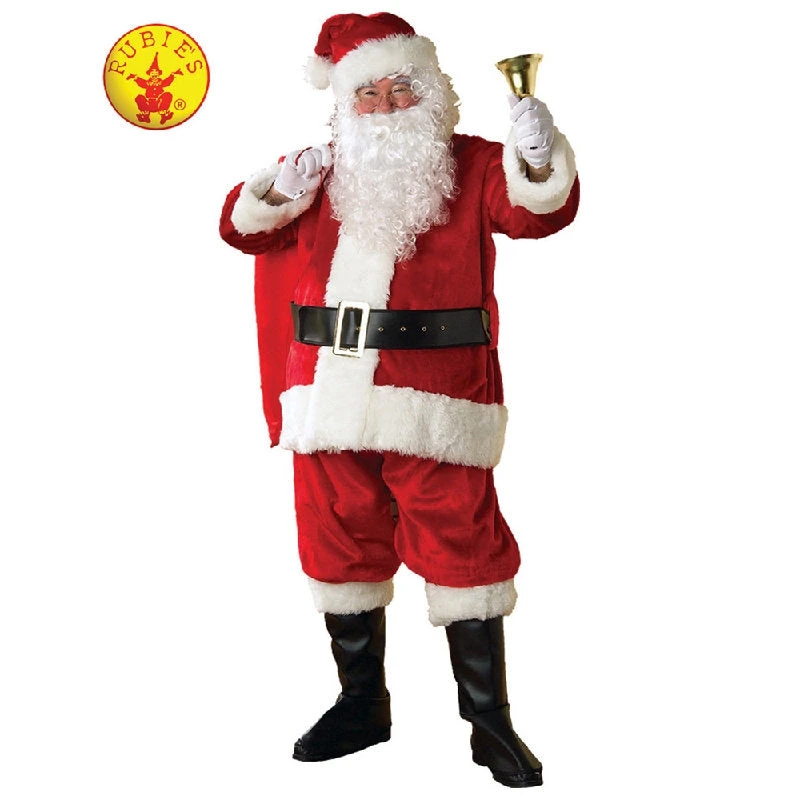 Deluxe non-stretch velvet Santa suit with satin-lined jacket showcasing a zipper front closure and faux fur trim plus lined elastic waisted pants with pockets
