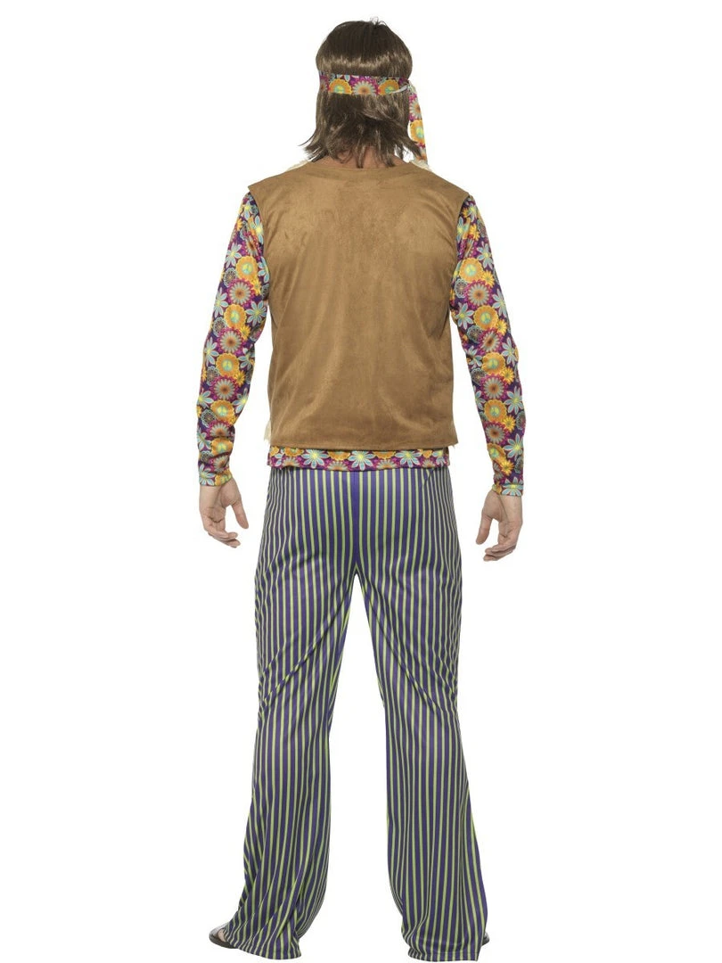 1960’s Men’s Hippie Singer costume has a colourful floral shirt front and sleeves, contrasting orange neckline and sash, attached brown fur trimmed vest. Matching floral headband and stripe flares are included. This look was made famous in the 60’s by Sonny from Sonny and Cher. Team up with your partner and wear our matching 60s Female Singer Costume