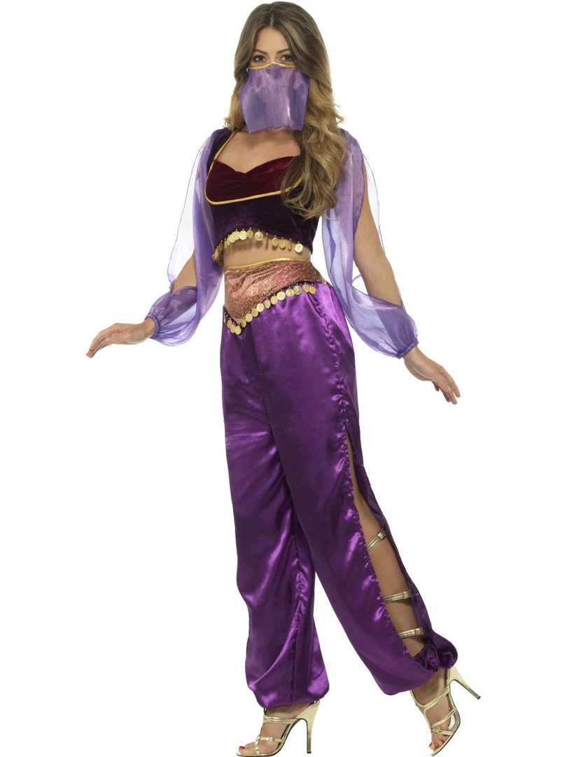 This Arabian Princess costume bodice is made of velvet with organza sleeves, trimmed in gold braid and gold coin trim on the front of the bodice. Purple satin pants with a slit from the thigh to the ankle, the pants have a contrasting panel with gold coin trim. The costume also includes a face veil.