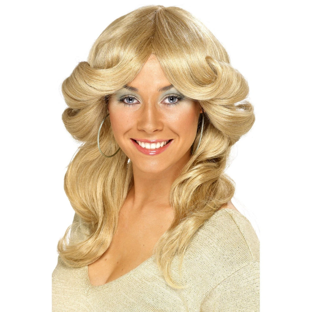 Blonde Flick Wig similar to Farrah Fawcet from the 1970s.