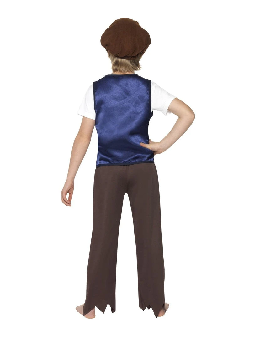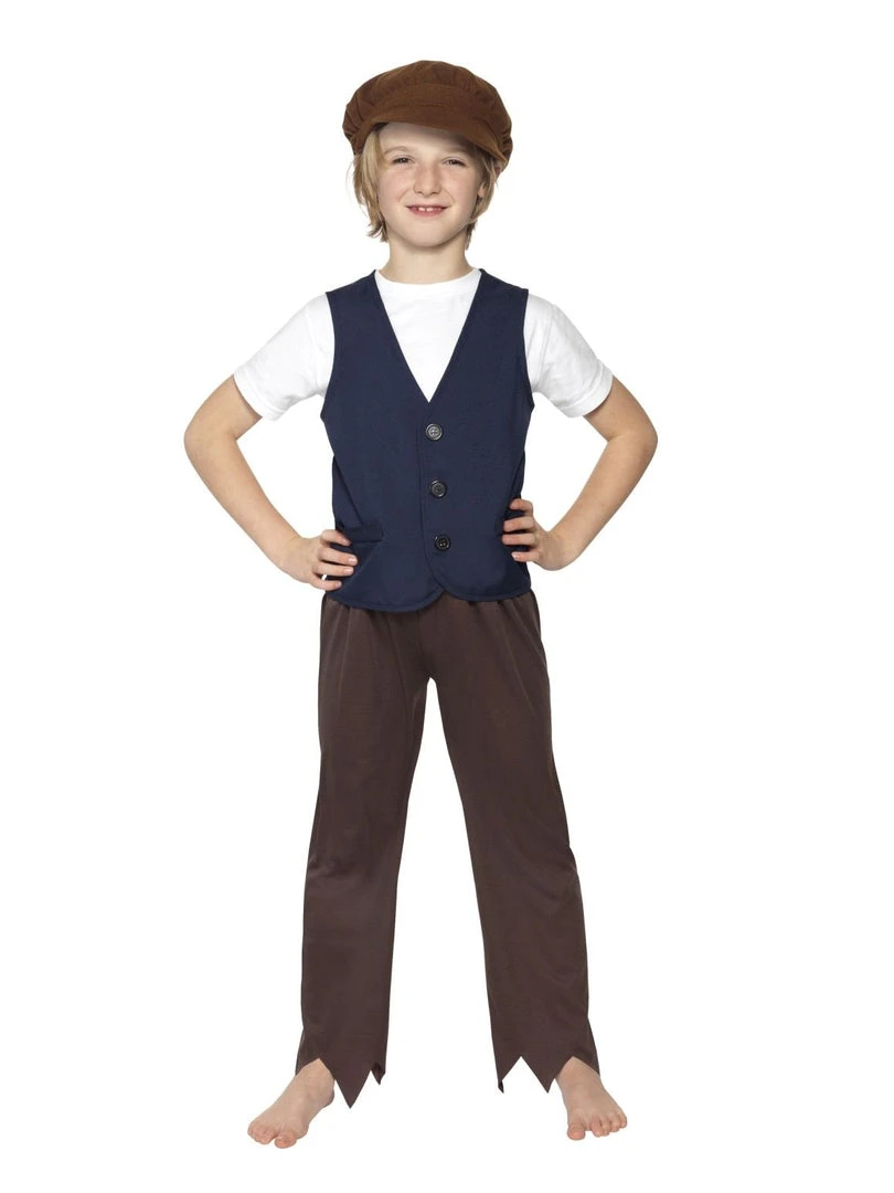 Victorian Poor Peasant Boy Kit includes navy vest and brown cap.