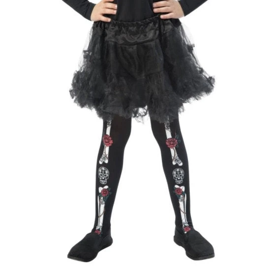 Day of The Dead Kids Tights have printed patterns of bones, skulls and roses. Ideal for dressing up your Childs Halloween costume.
