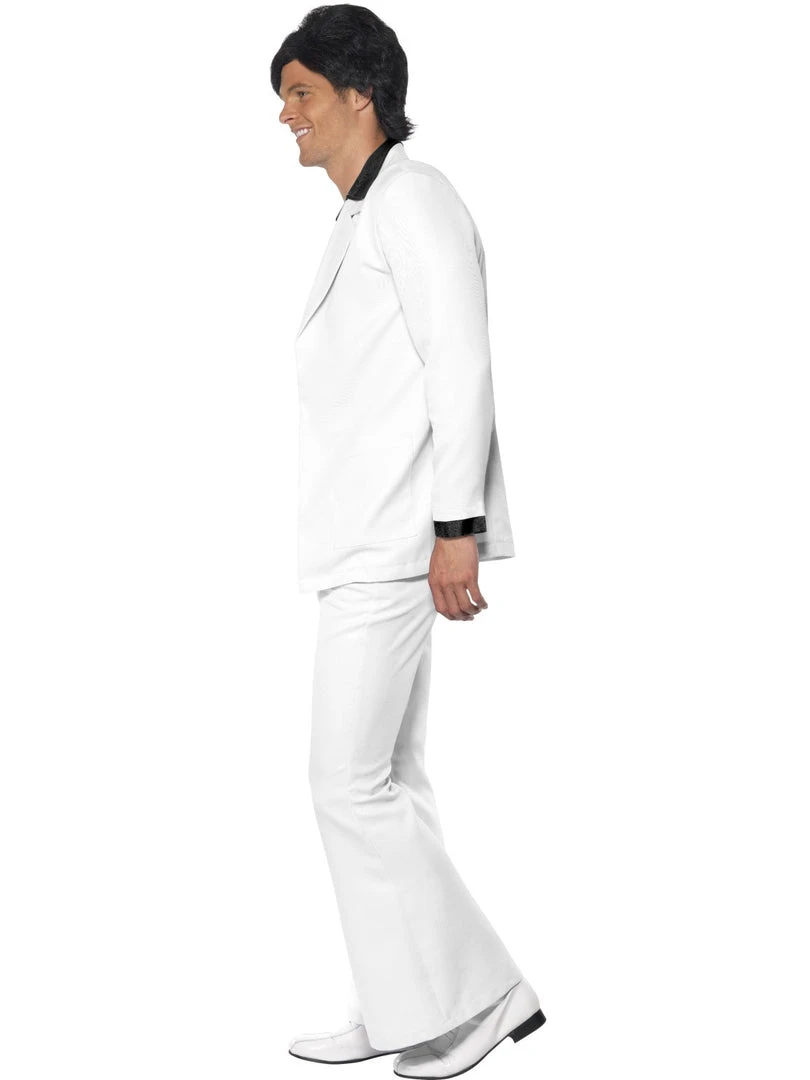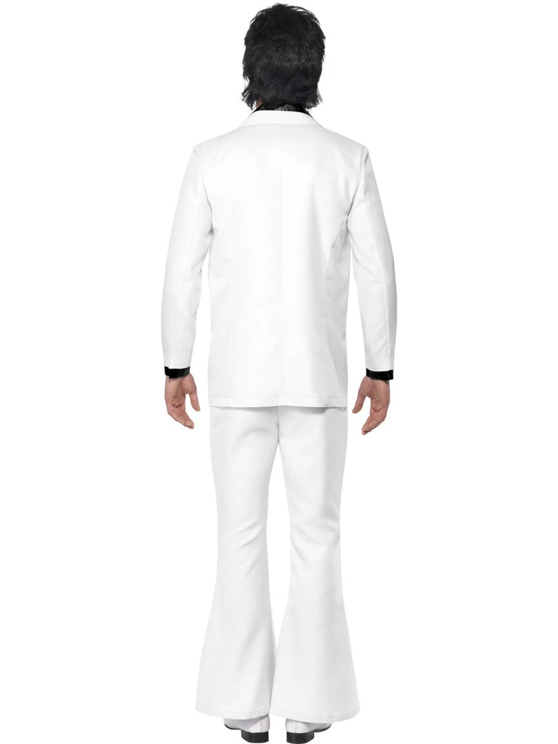 1970s style flared white suit includes: Jacket, Mock Shirt, Waistcoat and Trousers.