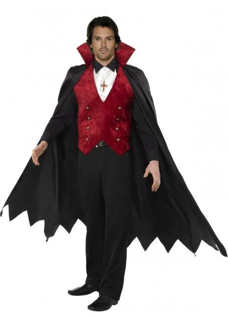 This is one of our best selling Halloween Dracula costumes. Smiffys presents to you our fantastic, old school Vampire Costume. This awesome costume comes complete with a gorgeous, blood red waist coat, a black and white cravat and a spooky, calf length Vampire cape.