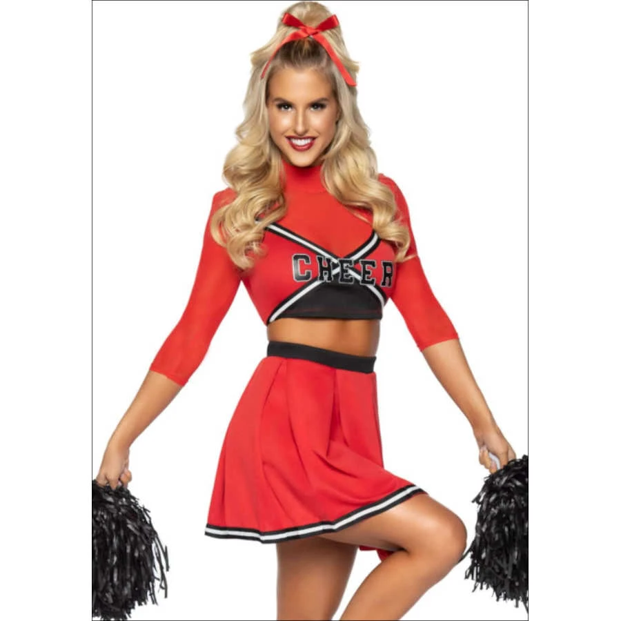 Get those spirit fingers ready, the 3 PC Varsity Babe Cheerleader Costume by Leg Avenue is sexy and cute and popular to boot! This cheer-tastic Halloween costume includes a cute crop top with cheer logo and sheer panels, pleated cheer skirt, and pom poms. Amazing quality and perfect fit. Fun for a Bring it On inspired group costume! This Varsity Babe cheerleader costume for women is perfect for 90’s costumes parties, Halloween night, or competing against the Clovers.