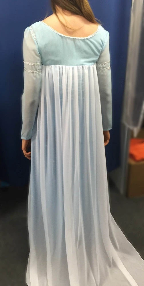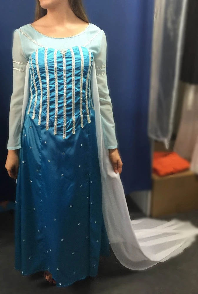This Snow Queen inspired dress is made from satin with an organza train with diamontees scattered over the dress. There is a tasteful slit in the skirt for ease of walking. The dress has lacing under the train for a better fit.