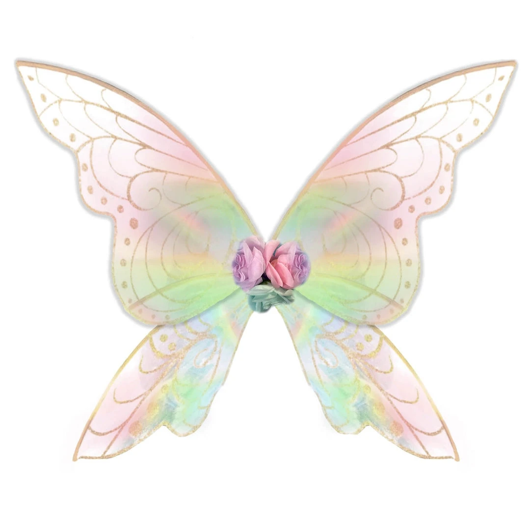 Join the mystical fairies of the forest floor with these aesthetically pleasing iridescent fairy wings!! The glittery wing outlines and beautiful flower arrangement in the center, and golden accents, is sure to make you stand out!! They work perfectly fairy outfit and if feeling a bit extra, your everyday attire!!