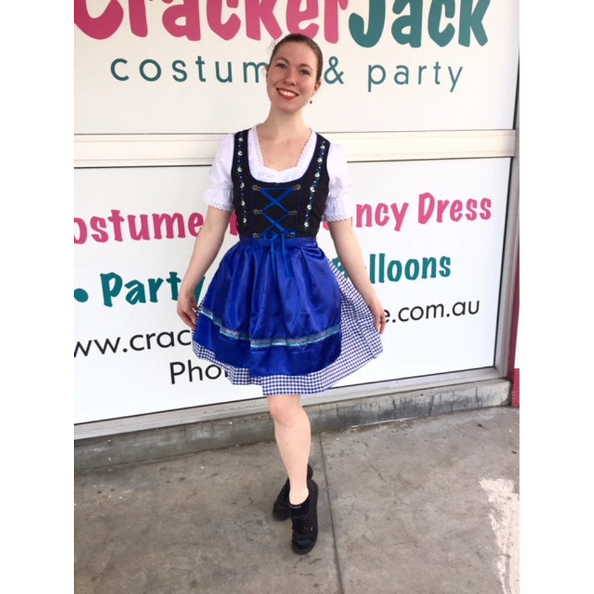 Deluxe quality Dirndl with blue check skirt, embroidered design on the black bodice, zips up the front and laces through the bodice to get a perfect fit. Cotton cropped top with cotton lace at neckline and the bottom of the puffed sleeves. Contrasting blue satin apron with decorative trim.