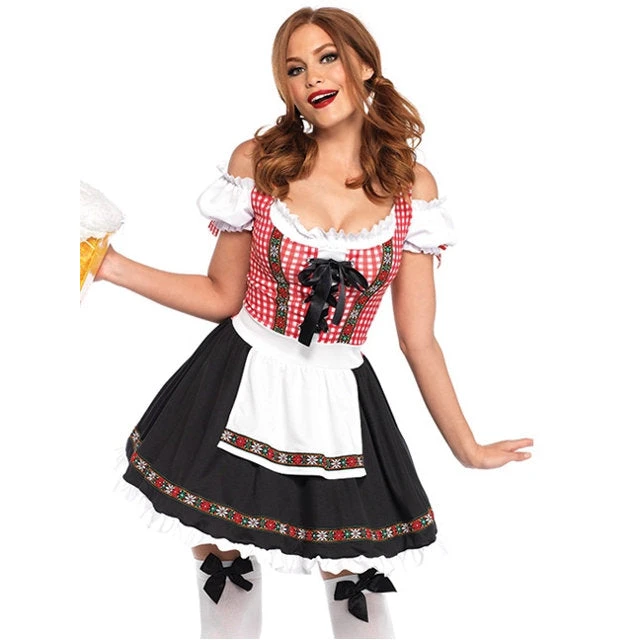 - This fun Oktoberfest costume features a gingham German peasant dress with lace up detail and cold shoulder accent, attached apron, and a festive floral ribbon trim.