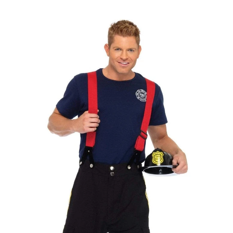 Fire Captain Mens Costume includes blue T-shirt with decal, black pants with hi-visibility detail and Red Suspenders.