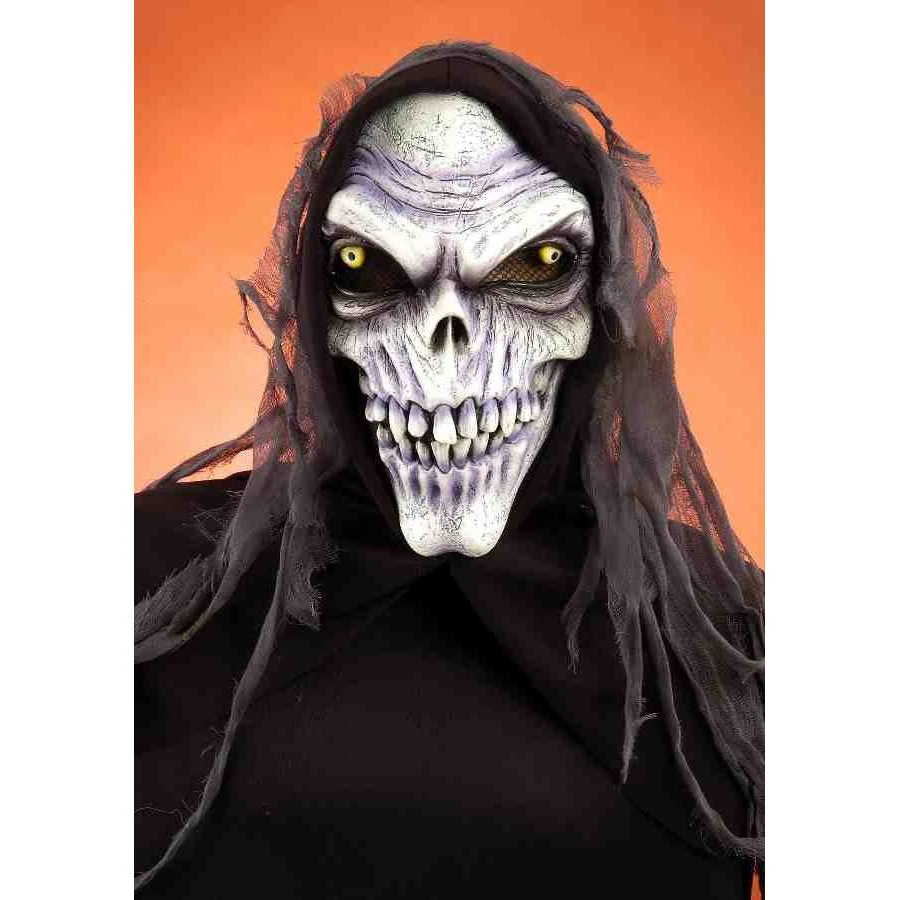 Hooded Corpse Skull Halloween Mask, with beady eyes. Your will scare all of your friends this Halloween in this terrifying mask. You can do a simply black tunic costume for the rest of your outfit, no makeup or hair styling necessary.