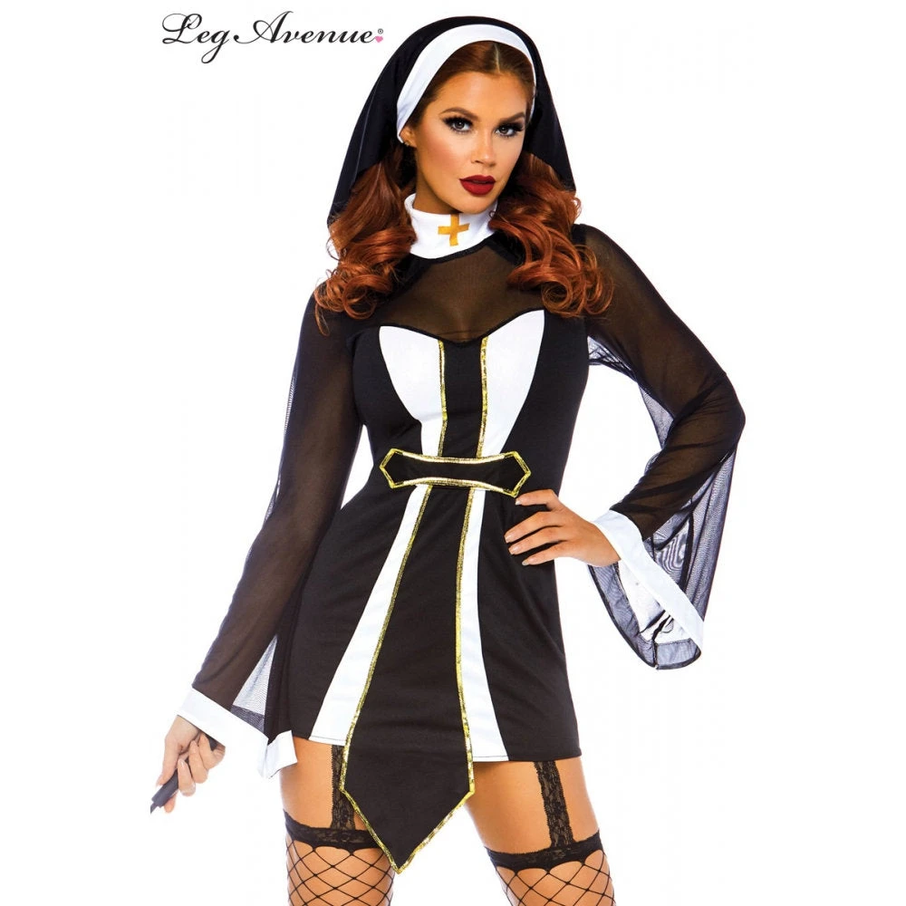 Ladies Twisted Sister Leg Avenue Costume includes black and white dress with cross detail and gold edging, and nun habit. This 2 PC Twisted Sister nun costume is the most twisted costume of them all! Perfect for Halloween, theme parties, and bedroom role-playing. Add some blood for a spooky Halloween look. Great for Letter N (Nun) and Letter S (sister) parties.