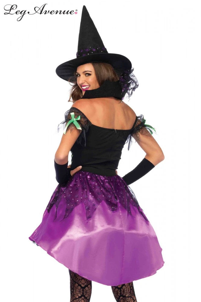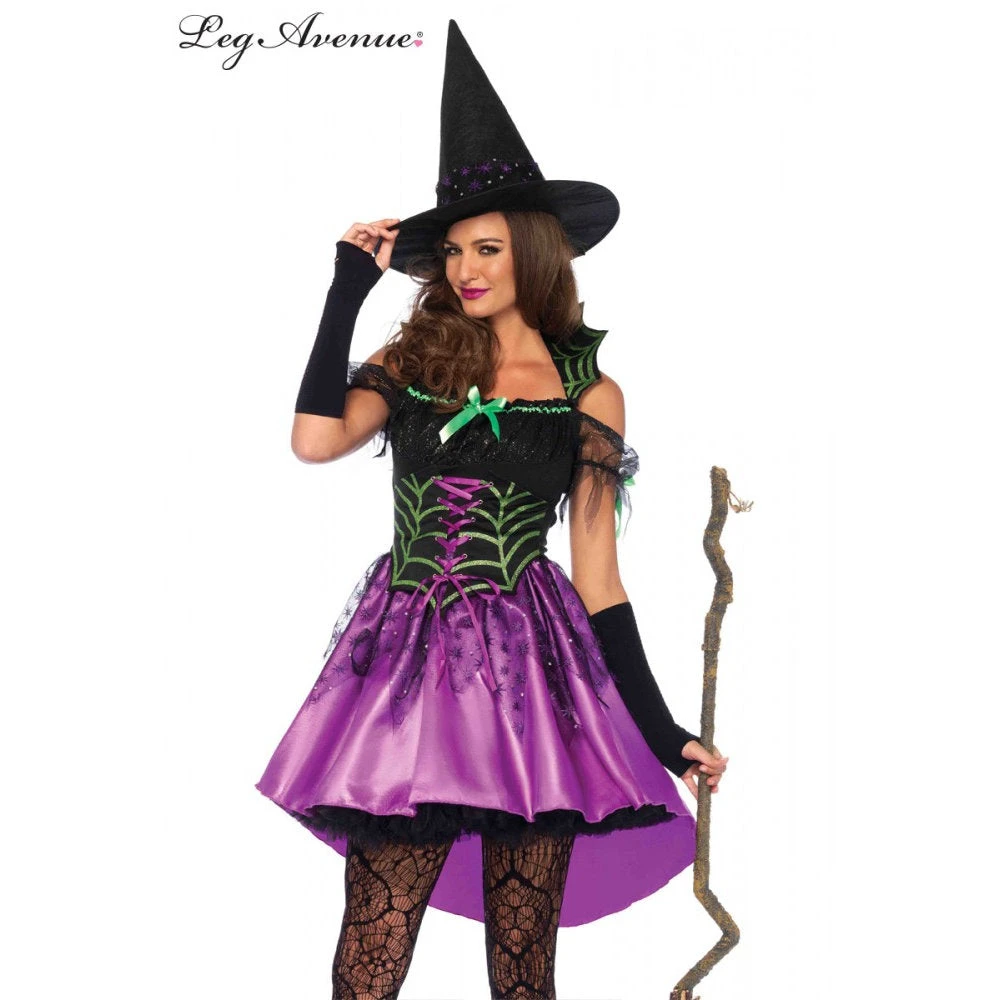 Have fun at Halloween in our Spiderweb Witch 2PC Costume includes glitter web dress with stay up collar and satin high/low skirt, lace up waist cincher accent and matching witch hat.