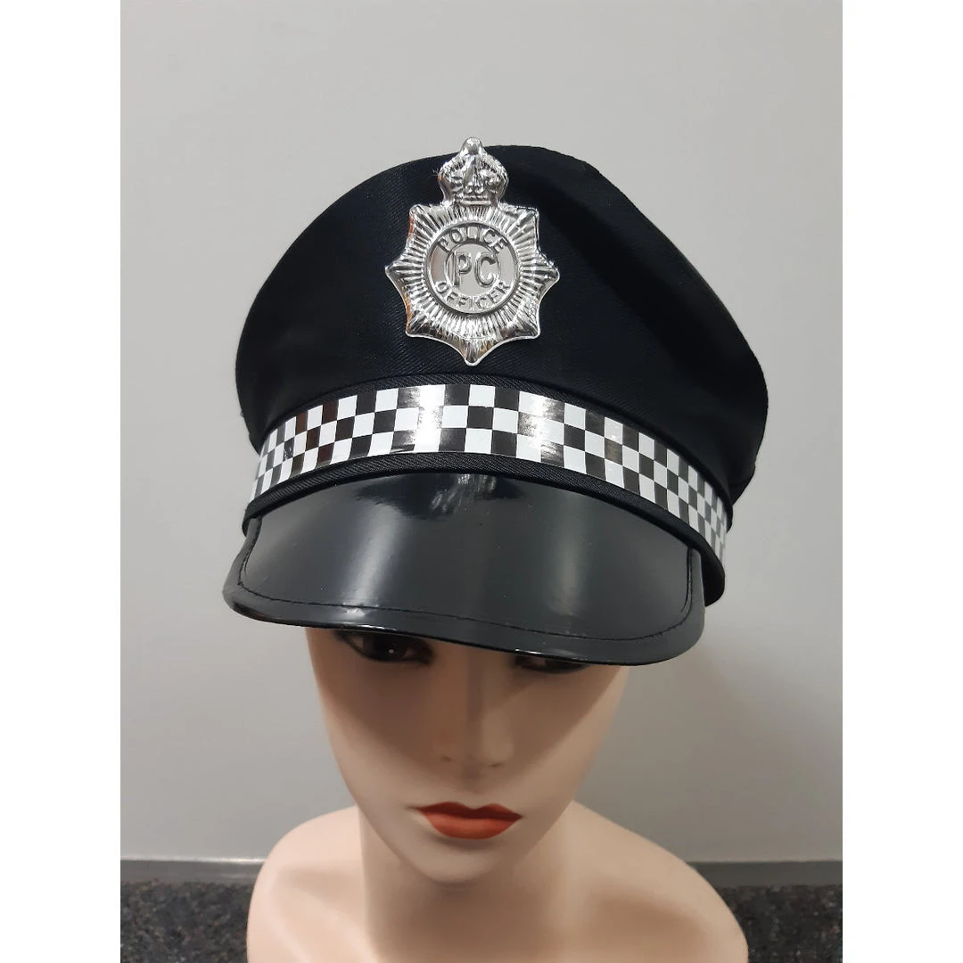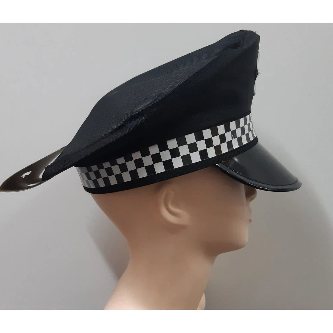 The hat is adult sized and includes check detail and a badge attached to the hat.