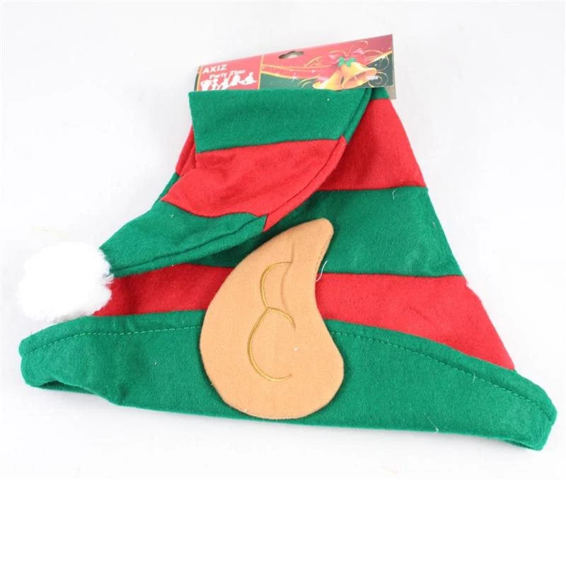 Red and green stripe Elf Hat with flesh coloured ears and white pom pom.