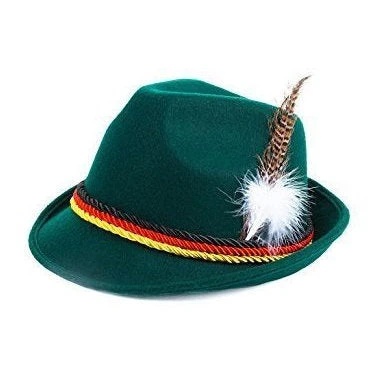 Forest green Oktoberfest Fedora with black, red and yellow cord band and small feather.